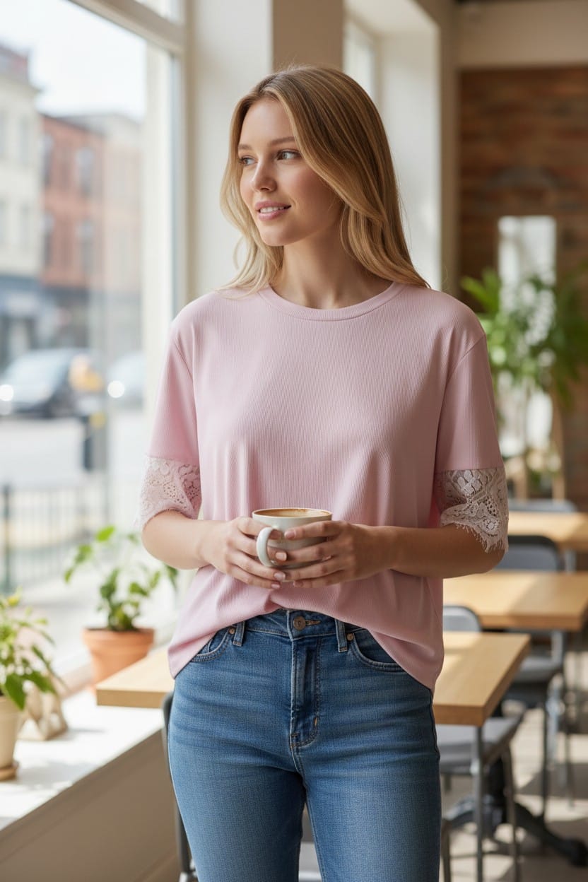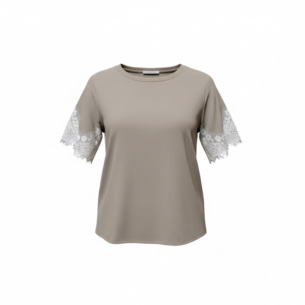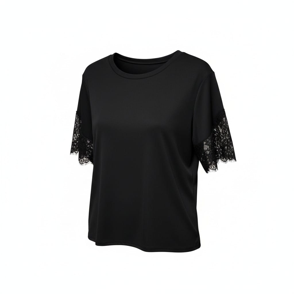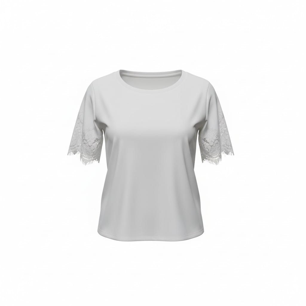 Camiseta de manga corta con tejido suave, cuello redondo y encaje en el filo de las mangas.